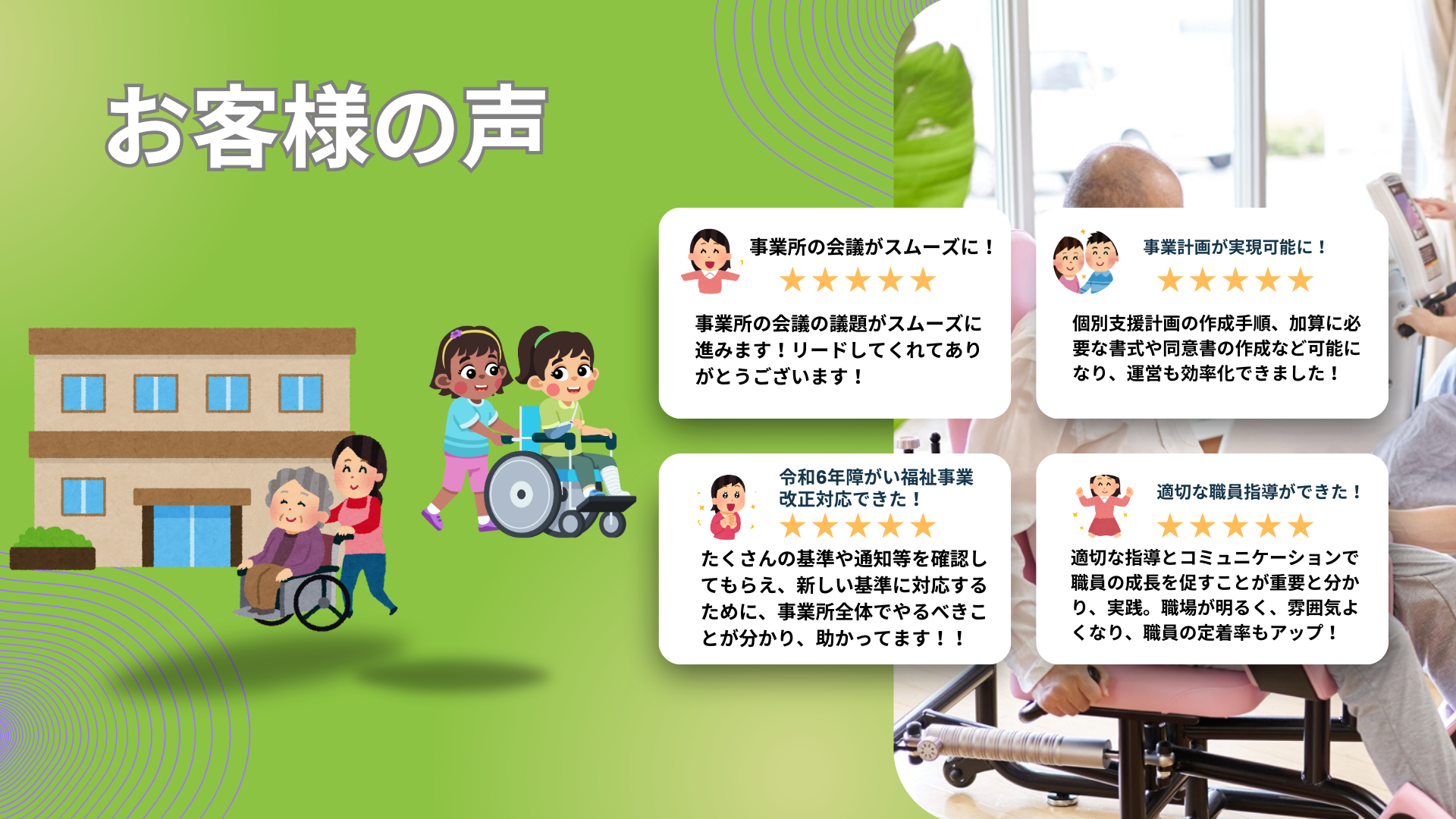 たくさんの基準や通知等を確認してもらえ、新しい基準に対応するために、事業所全体でやるべきことが分かり、助かってます!!